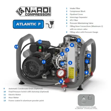 O NARDI ATLANTIC 100 é um compressor portátil projetado para entrega de ar respirável com alta confiabilidade e baixo custo operacional. Com bloco de 4 estágios, serpentinas de resfriamento e filtro ATL, o equipamento atende aos requisitos da norma DIN EN 12021. Ideal para mergulho, inspeções, resgate e aplicações offshore.